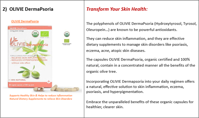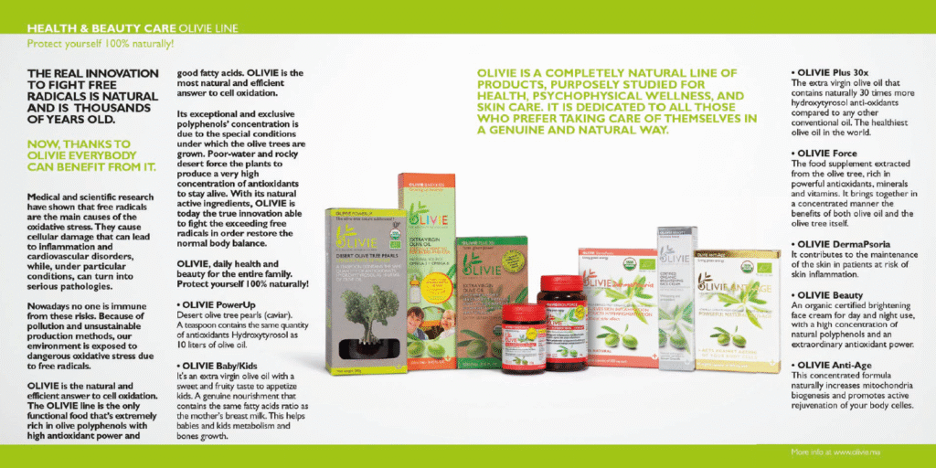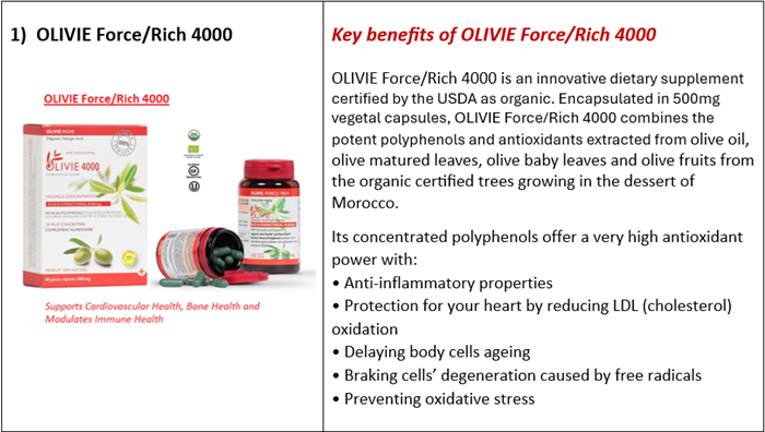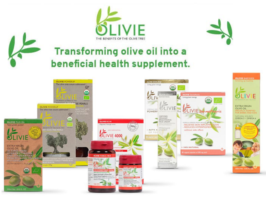 OLIVIE is a brand name of Dietary Supplements manufactured by the GMP facilities of OLIVIE PHARMA, a division of the ATLAS OLIVE OILS company in Morocco.Olivie Products contains high concentration of Olive Polyphenols (Hydroxytyrosol, Oleuropein, Oleocanthal , Tyrosol) extracted from Organic Olives grown in the dessert of Morocco by physical extraction without the use of additives or solvent.